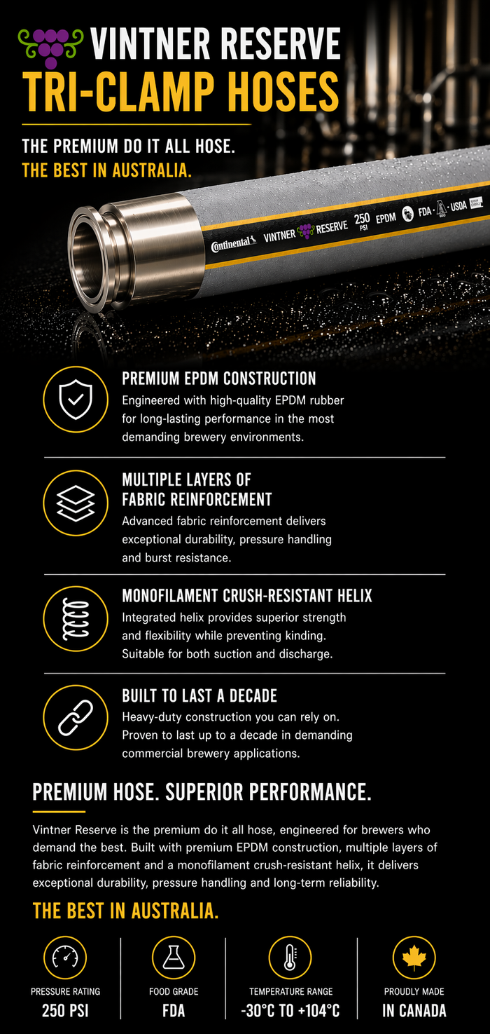 Our hoses are supplied as standard with Tri-Clamp (Tri-Clover) ends β the industry-standard connection used in most Australian breweries.